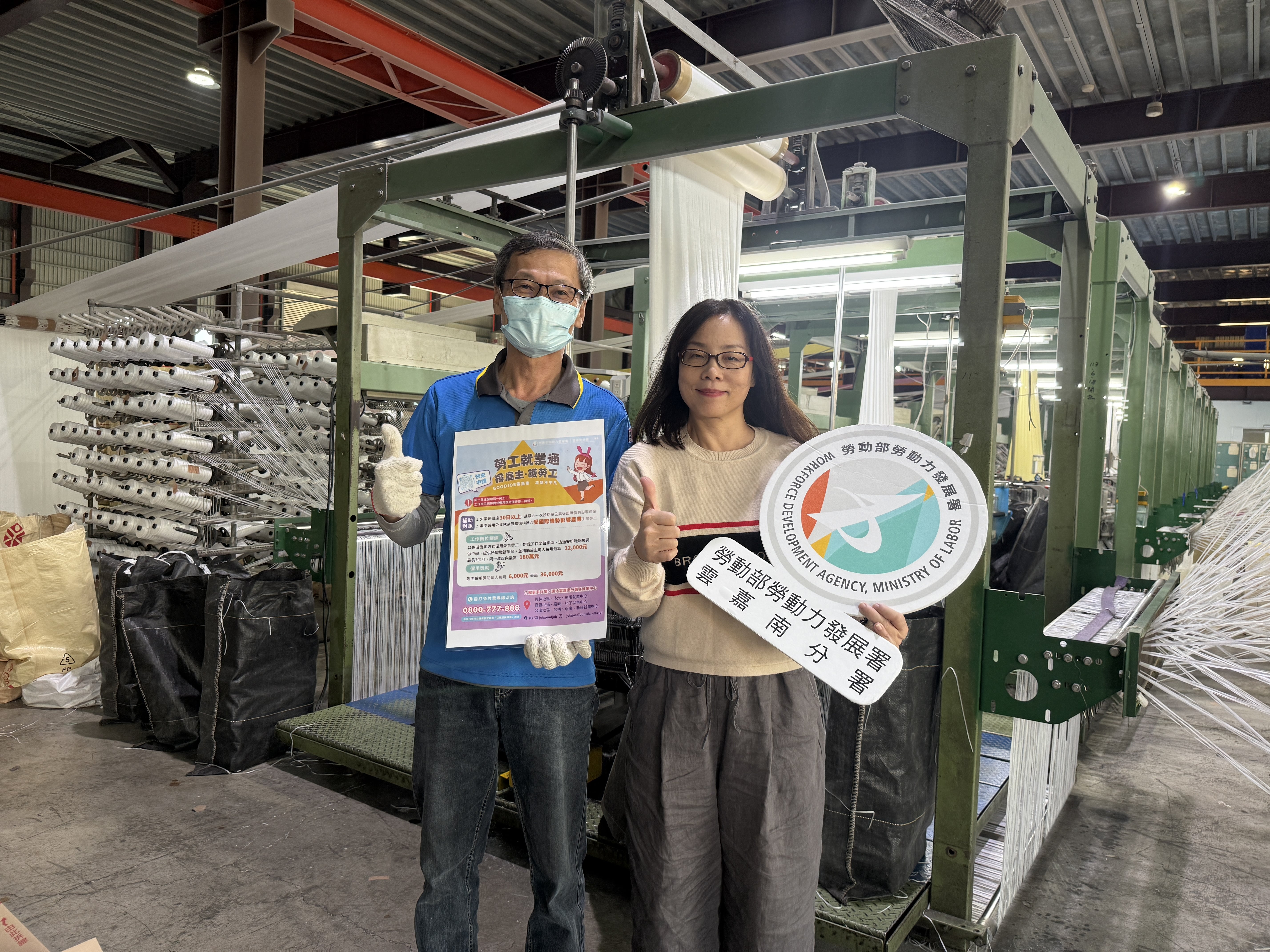 張姓就服員透過深度諮詢發現阿坤雖已逾中高齡,但其良好的職場態度及工作經驗,仍是不可多得的產業即戰力,便運用僱用獎助措施及就業促進工具,僅1個多月的時間、就成功媒合至唐聚企業股份有限公司擔任產線技術員,負責料袋整理、紡織印刷機台操作及倉儲等工作,另因其產業屬製造業之3K產業,就服員也協助阿坤申請缺工就業獎勵,除薪資外還能領到最高合計10.8萬元的獎勵津貼,除讓阿坤順利續寫職涯新歷程,也協助企業找到人才、緩缺工,營造勞雇雙贏!