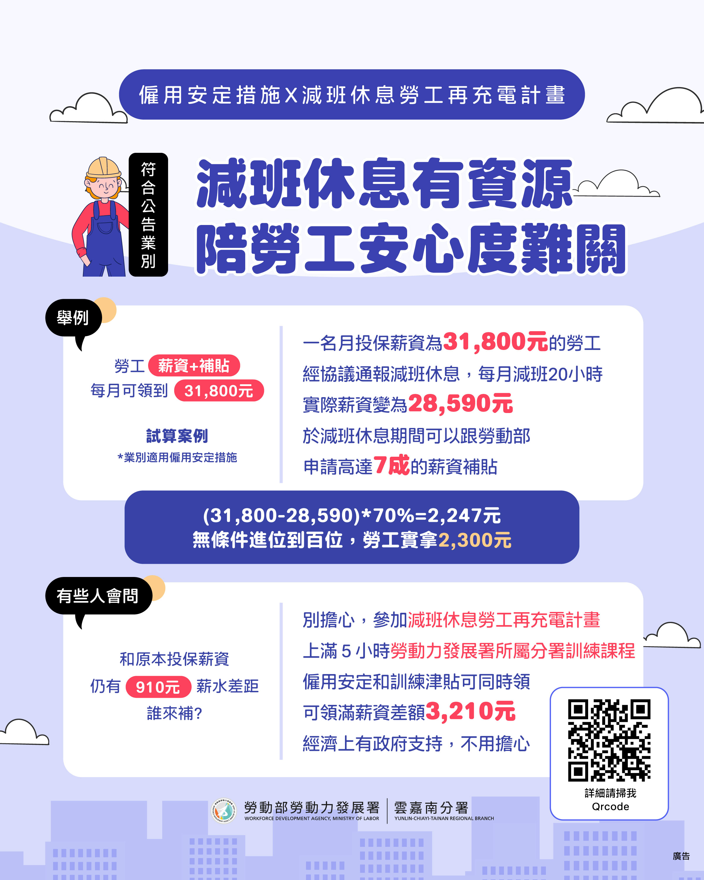劉邦棟進一步說明,若勞工受僱於符合「僱用安定措施」公告的9大行業,可申請最高7成薪資補貼,若同時參加再充電計畫訓練課程,還能合併申請訓練津貼,短少的薪資可透過薪資差額補助及訓練津貼補足。呼籲符合資格的在職勞工與事業單位多多利用,把危機轉化為契機,更多資訊可至再充電計畫專區(https://onjobtraining.wda.gov.tw/)查詢,或撥打免付費專線0800-777-888,也可逕洽雲嘉南各就業中心。